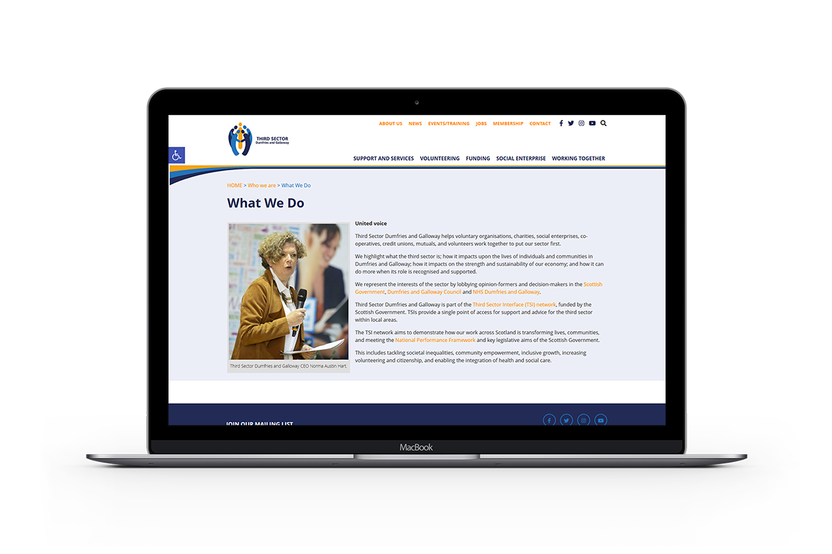 Third Sector Dumfries and Galloway helps voluntary organisations, charities, social enterprises, co-operatives, credit unions, mutuals, and volunteers work together to put their sector first. They represent the interests of the sector by lobbying opinion-formers and decision-makers in the Scottish Government, Dumfries and Galloway Council and NHS Dumfries and Galloway.