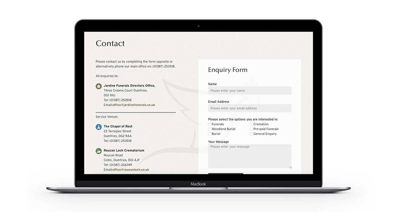 Jardine Funeral Directors is a family business based in Dumfries that has been running since the 1800s. They have been a large part of the community in D&G for a very long time, often supporting people at low moments in life. Losing somebody close to you is a very challenging and confusing time, so it was important to Jardines that their site act as a resource with information on which steps to take next.