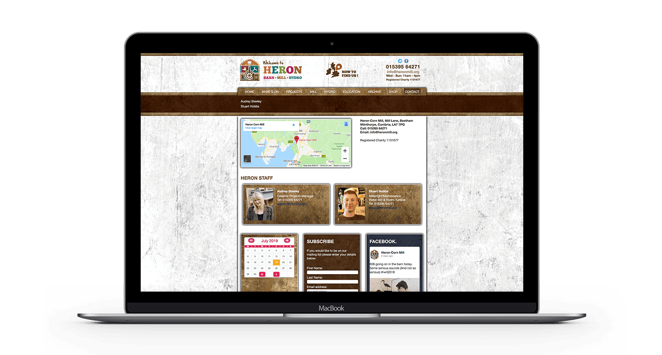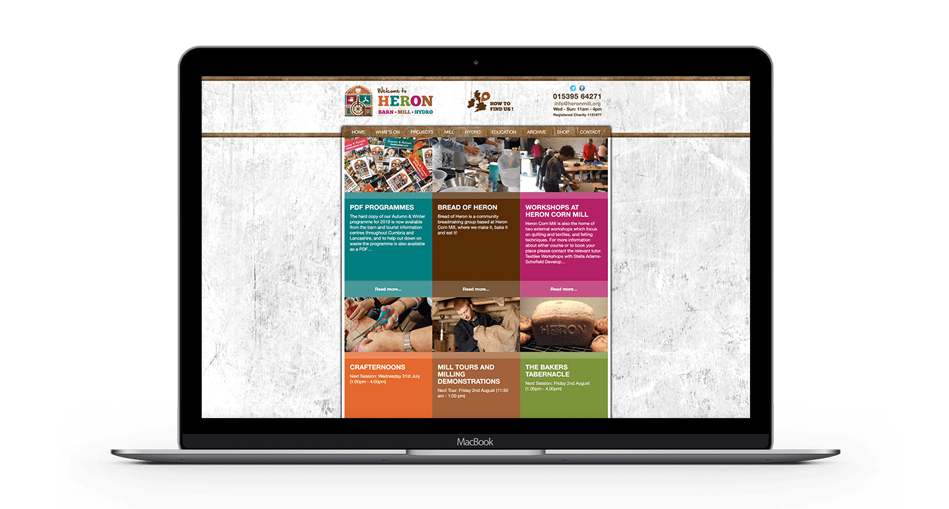 We had a wonderful time creating a colourful, illustrative new brand and website for the Mill. The logo is an abstracted mill with various elements representing the different events and services within the mill. The website gives information on the history of the mill and offers an events calendar and shop. We also designed expansive signage and way-finding materials for the mill, as well as merchandise items such as mugs and hard hats.