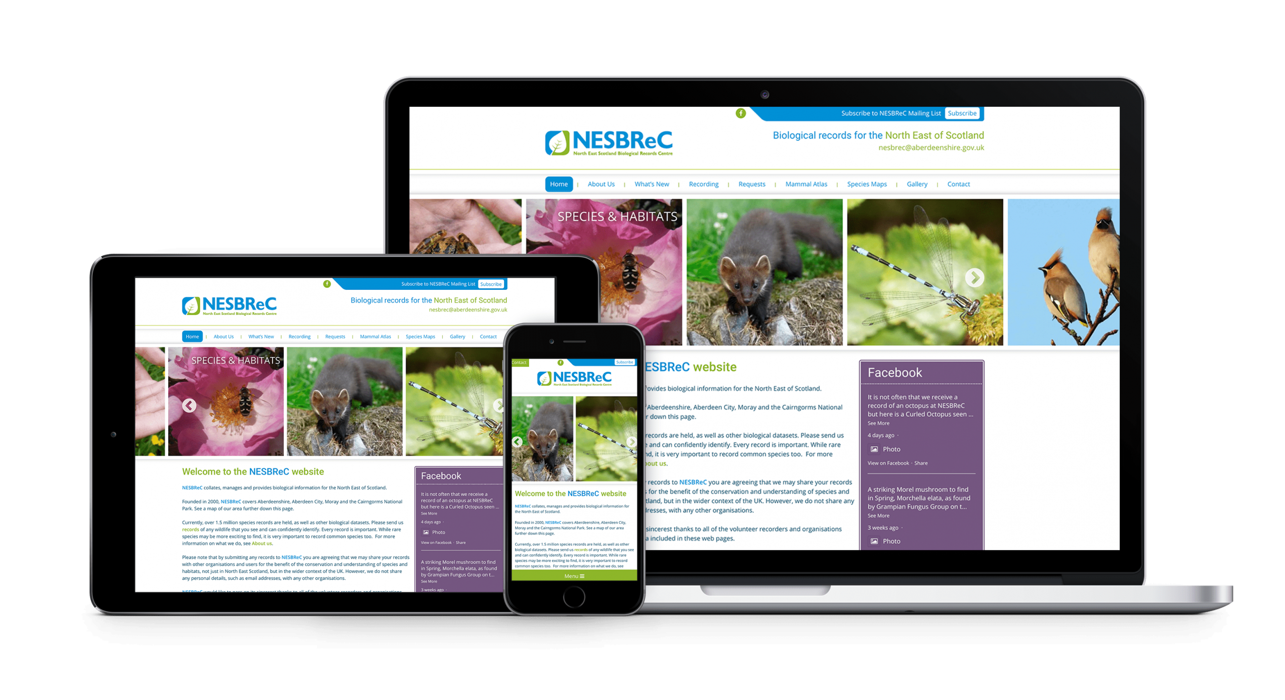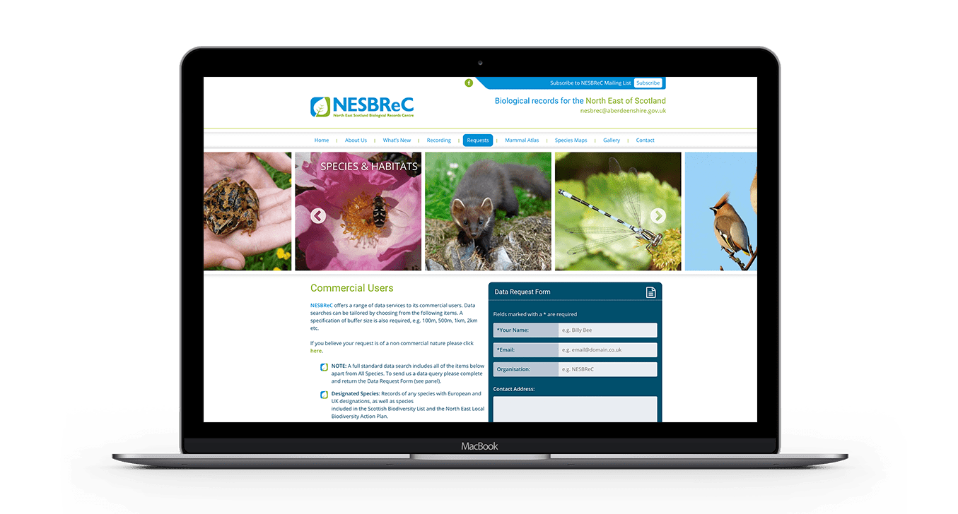 We were asked to develop a modern brand and website for NESBReC. We wanted the brand to suggest youth and regeneration, so we developed a palette of blue and green reflecting the natural environment. The responsive website features maps, news articles, forms and galleries.